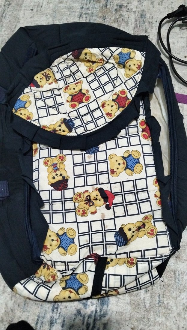 Koyu renkli, çok renkli bebek taşıyıcı, yumuşak kumaş üzerinde ayı desenleriyle konforlu ve şık taşıma sağlar ve bebek çantası.