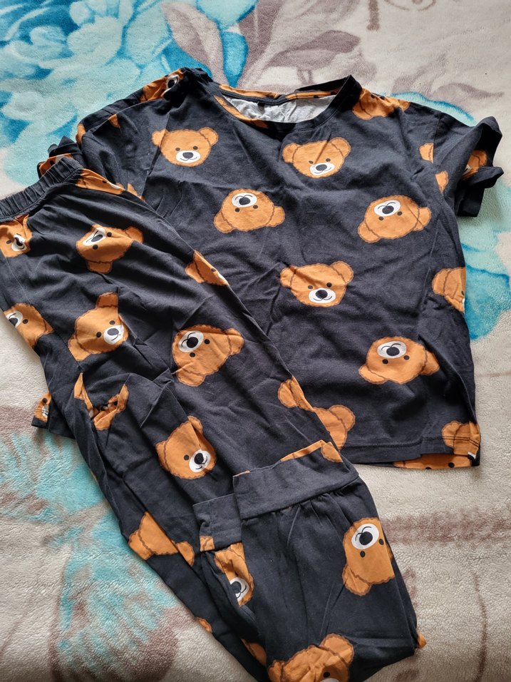 Kısa kollu, midi boy ve bol kesim kadın pijama takımı, koyu kahverengi ayı baskılı. Rahat ve konforlu kullanıma uygundur.