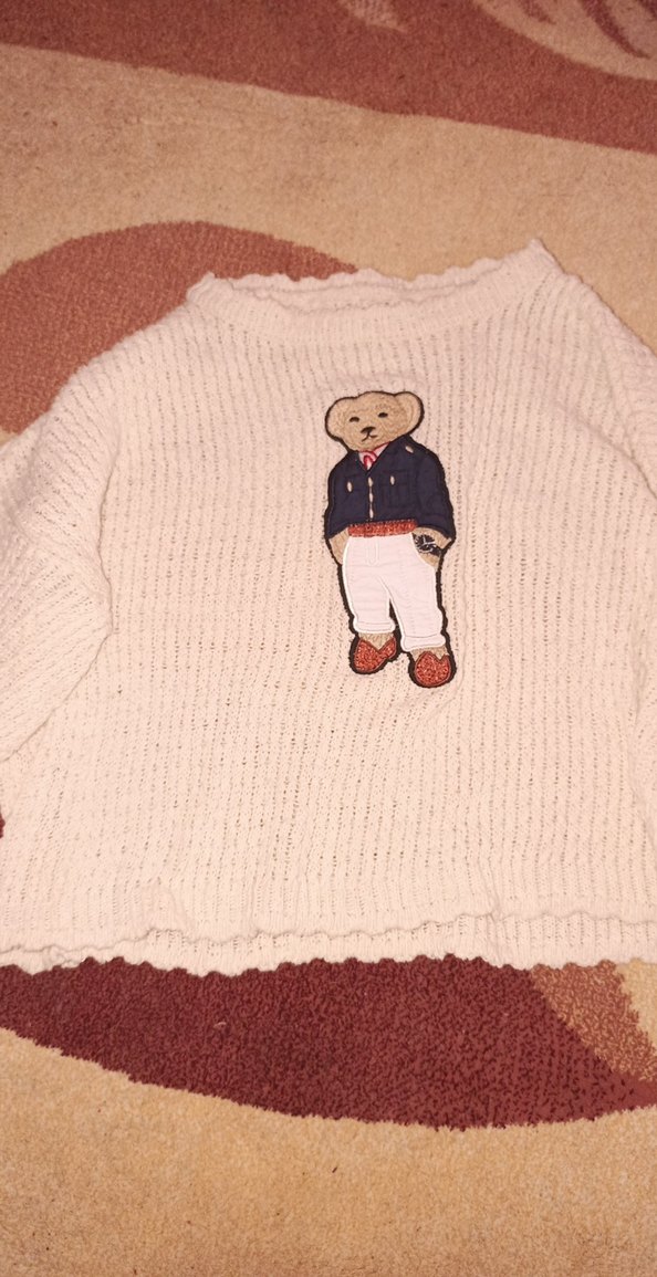 Beyaz renkli, örgü kumaştan yapılmış, ayı figürlü, uzun kollu ve normal boyda rahat kesim kadın kazak.