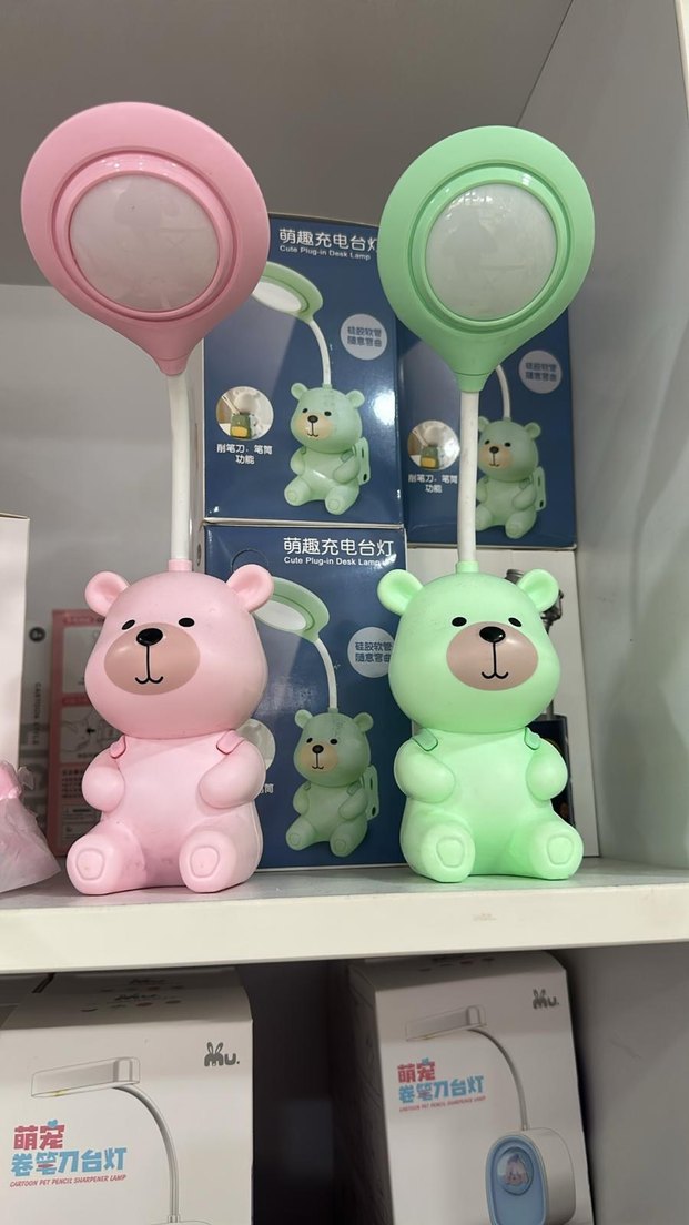 Pastel pembe ve yeşil ayı figürlü masa lambaları, esnek boyunlu ve yuvarlak ışık başlıklı. Üzerinde "Mu, Mu." yazısı bulunur.