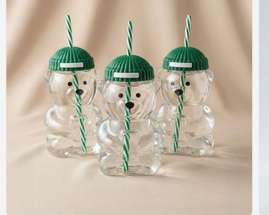 Ayı şeklinde şeffaf cam bardaklar, yeşil dokulu kapak ve çizgili pipetle birlikte. Kapaklar sağlam kapanır, her bardağın iki küçük tutamağı vardır.