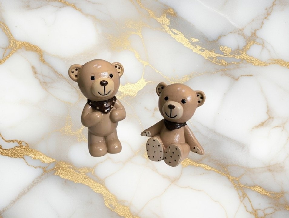 İki adet pastel kahverengi ayıcık biblo, sade yüz detayları ve koyu kahverengi fularlarla. Biri ayakta, diğeri oturur pozisyonda, dekor için uygun. handmade