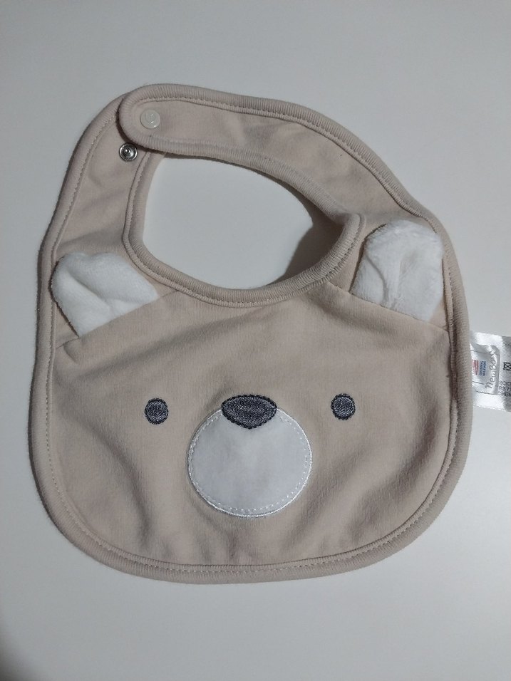 ayıcık yüzlü, çıtçıtlı bej bebek önlüğü. Yumuşak kumaş ve sevimli kulak detayları içerir. yenidir