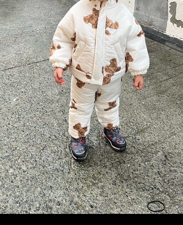 Ayıcık desenli beyaz puff mont ve pantolondan oluşan, yumuşak ve sıcak kumaşlı bebek kar tulumu.