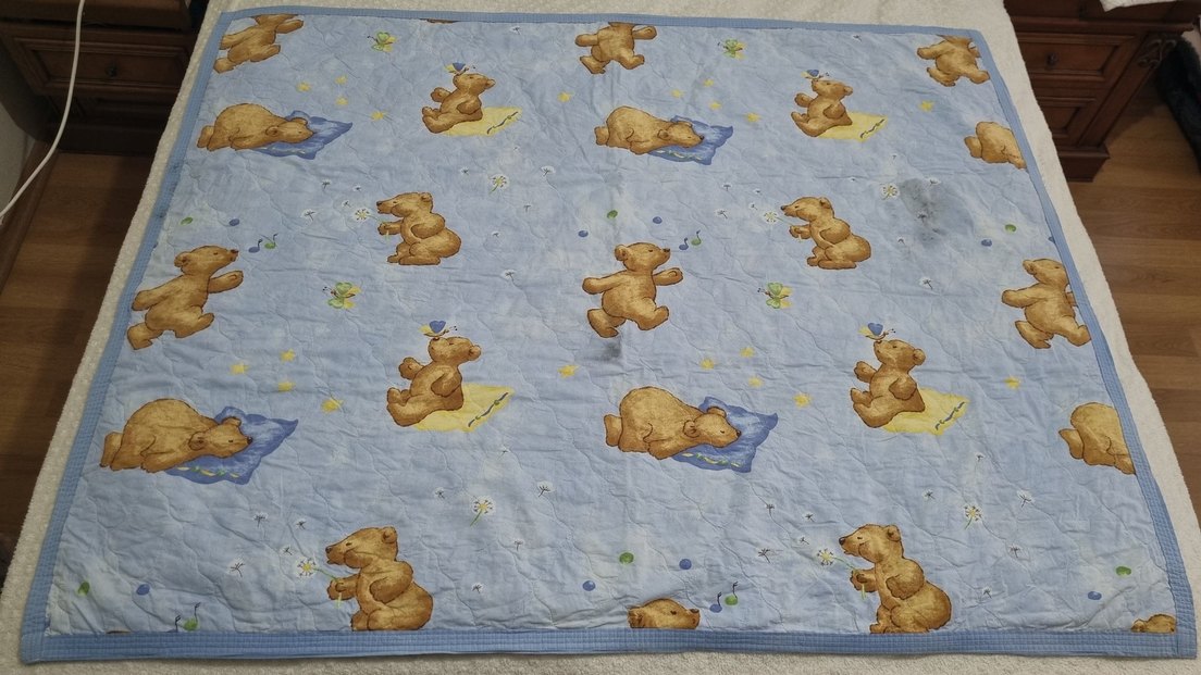 önü ayıcıklı arkası gökyüzü desenli, kullanılmadı. taşınırken siyah lekeler oluşmuş. Silince çıkar mı bilmiyorum ama fiyata yansıttım. ölçüleri 145x115cm