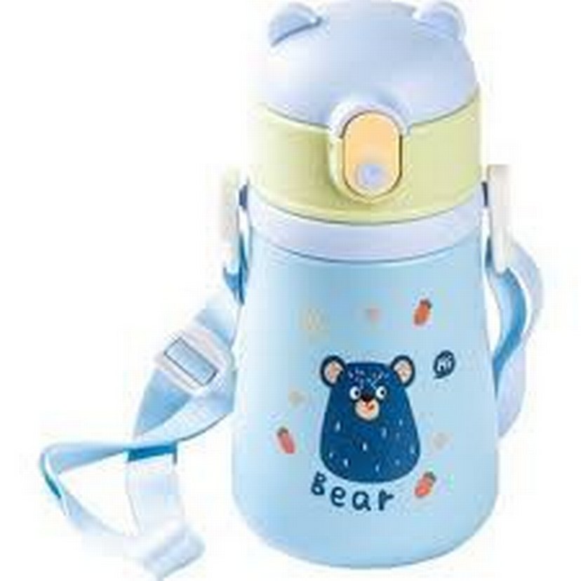 Ayıcık desenli, renkli mavi çocuk termosu. Kolay taşımak için askısı ve güvenli kapağı bulunur. İçecekleri sıcak veya soğuk tutar.