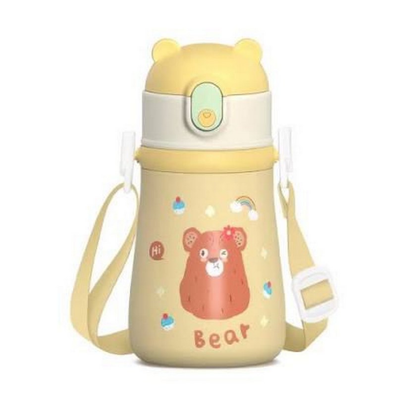 Ayıcık desenli, sarı renkli çocuk termosu, güvenli kapak ve taşıma askısıyla birlikte gelir. İçecekleri sıcak ve soğuk tutar.