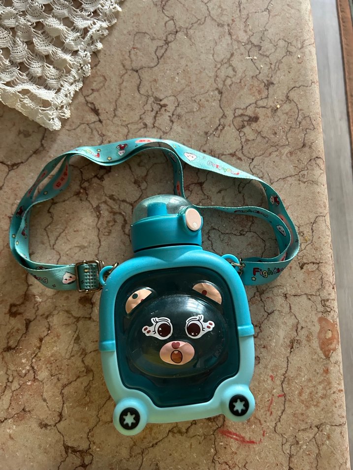 Mavi renkte, ayıcık figürlü çocuk matarası, kolay taşınması için renkli askıya sahiptir Sadece içindeki pipeti kayıp onun dışında bir sıkıntısı yok