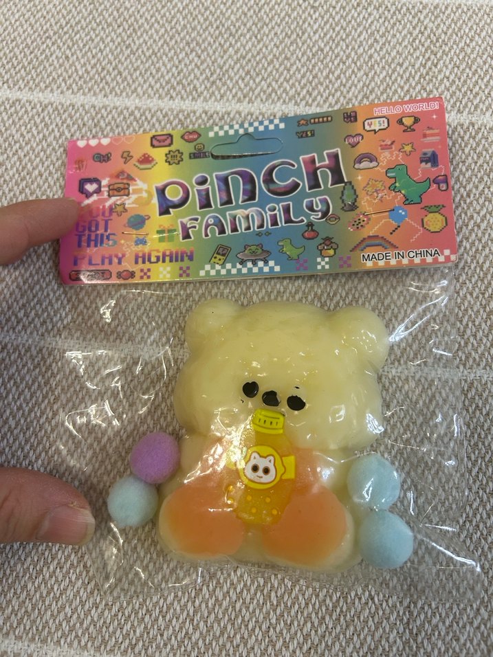 Pastel sarı renkte ayıcık figürlü oyuncak, küçük bir şişe tutuyor ve renkli yumuşak toplarla çevrili. Ambalajda Pinch Family markası ve eğlenceli grafikler bulunuyor.