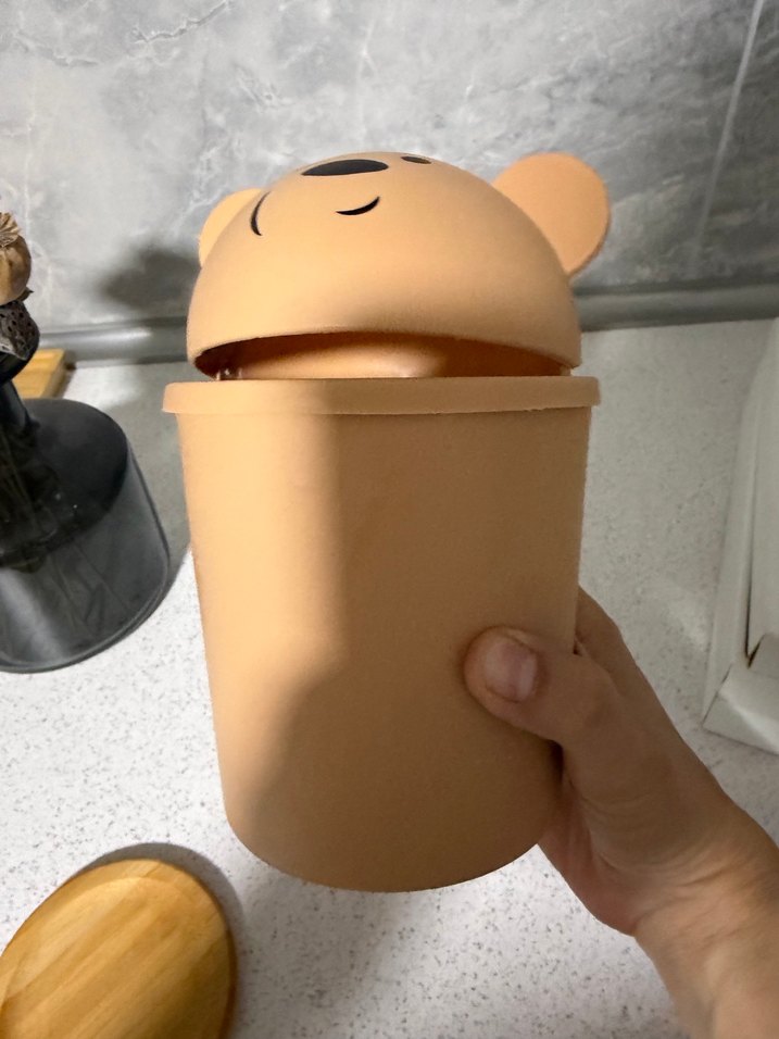 Pastel ayıcık şeklinde kapaklı bej saklama kabı, pratik ve şık kullanım sağlar. Çöp kovası olarak yada pamuk için kullanılır
