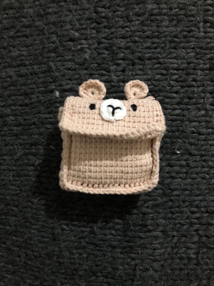 Pembe renkli, sevimli ayı yüzlü, yumuşak kumaştan yapılmış kulaklık kılıfı.