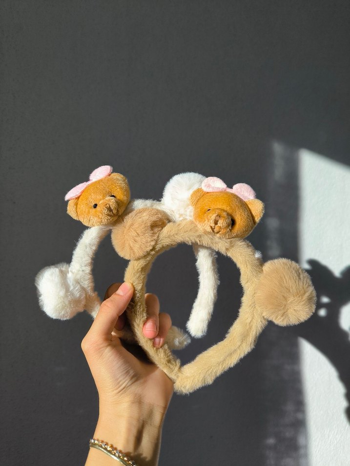 Kürklü detaylı, nakışlı ayıcık figürlü bej pastel renk çocuk saç bantları, bohem ve retro tarz için uygundur. ayıcık peluş taç