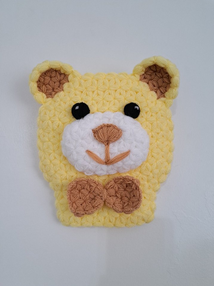 Kulakları ve papyonu detaylı, ayıcık şeklinde renkli sarı banyo lifi.Bebek ceyizlerinin harika bir parçası olabilir.Sevgiyle örüldü.
