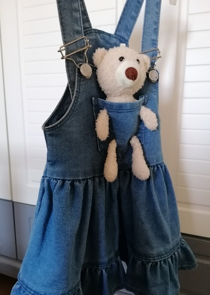 Sadece 3 kez giyildi. Hiçbir sorunu yoktur. Çok çok tatlı bir elbisedir. #bebekkotelbise #bebekkotsalopet #kotelbise #jeanelbise #teddybear #teddyelbise #ayiciklijeanelbise #ayiciklisalopet #peluşayiciklielbise