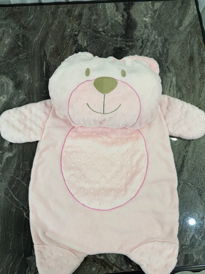 Nakışlı ayı yüzü ve dokulu kumaşıyla yumuşak, sıcak pembe bebek alt açma örtüsü,nerdeyse hiç kullanılmadı,tertemizdir,herhangi bir defosu yoktur