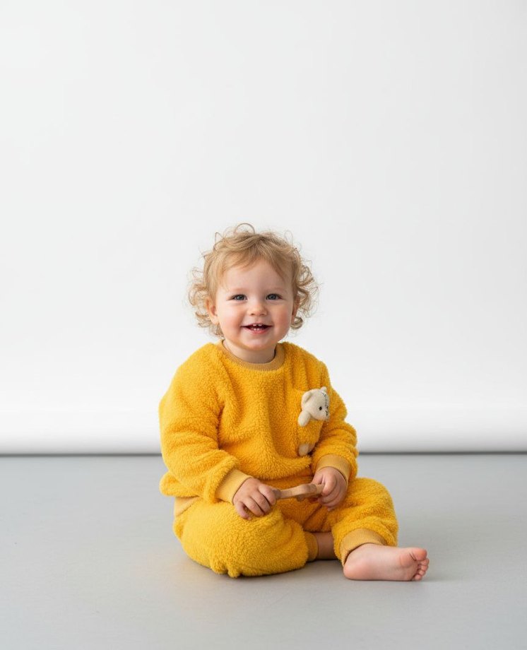 Sarı ayıcıklı unisex peluş çocuk takım etikette 8 yaşa kadar yazıyor ama ürünlerimizin kalıpları küçüktür.