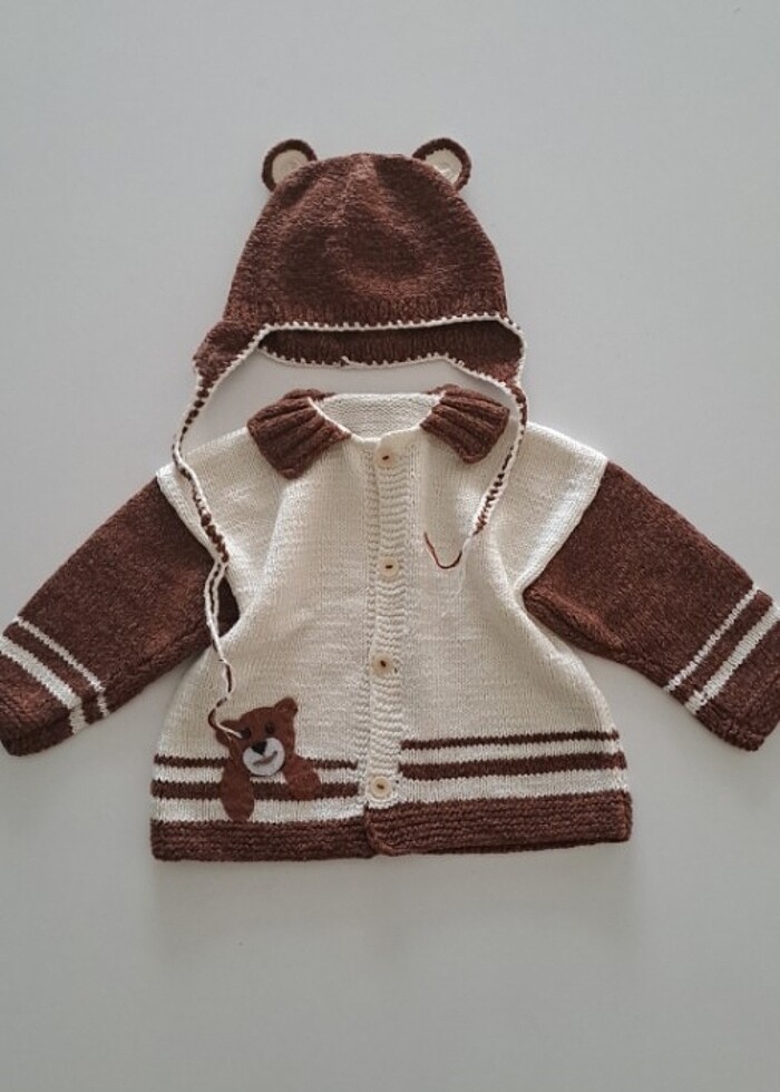 Ayıcıklı şapkalı takim hirka el örgüsü Sadece 2 kez giyildi sıfır ayarında bir üründür. Hediye orulmustu oğluma küçük geldiği için pek giydirme fırsatım olmadı.