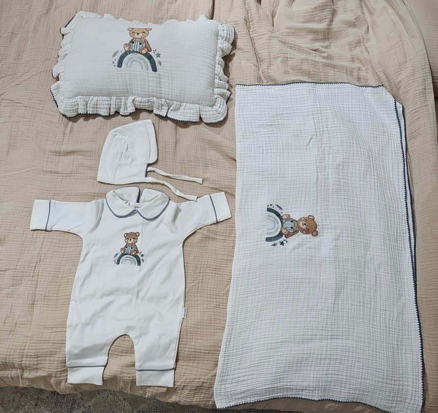 Setin içeriği Müslin ayı baskılı bebek battaniyesi Ayı Baskılı Pamuk Takım ve Şapkası Yastık Kiyafet hic giydirilmedi.Örtü hic kullanılmadı.Sadece yastık kullanıldı.