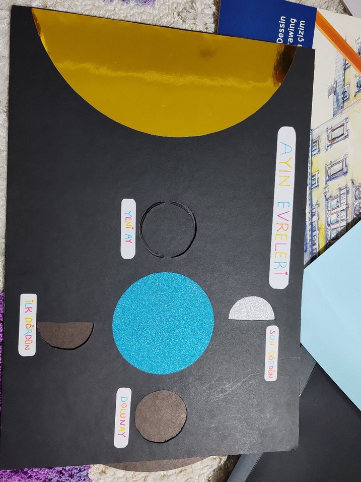 Ayın evrelerini gösteren renkli, etiketli bir okul projesi. Farklı şekil ve renkler koyu zemin üzerinde yer alıyor. El emeği mekanizmalı