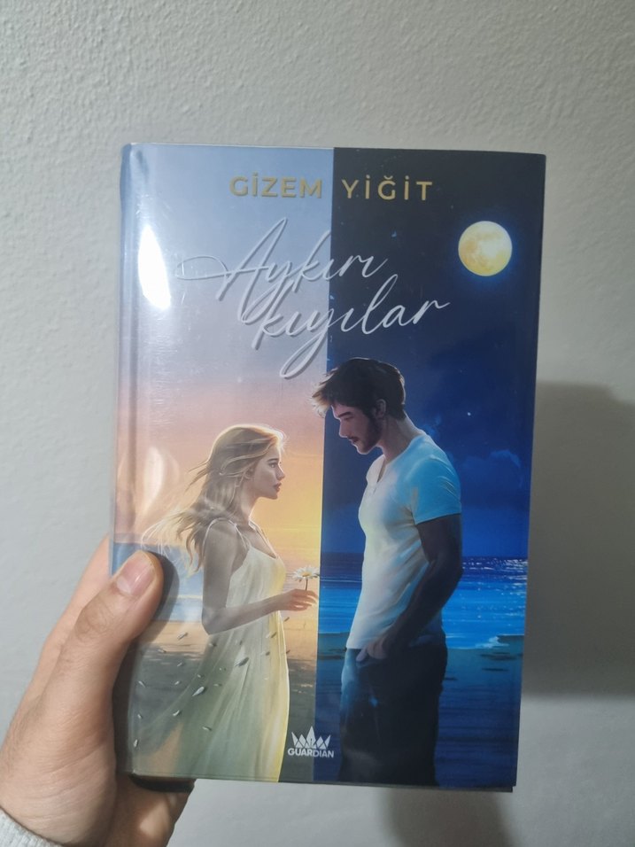 Gizem Yiğit'in Aykar Kıyılar romanı, deniz kıyısında geçen romantik bir hikayeyi anlatıyor. Kapakta iki kişi ay ışığında karşı karşıya duruyor.