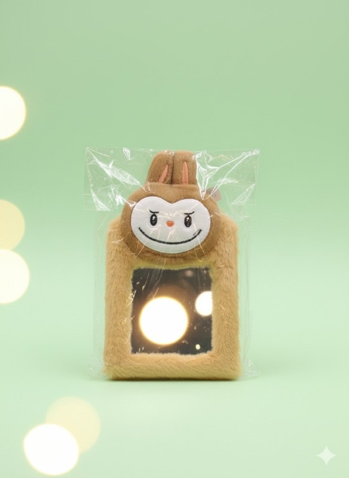 Yumuşak dokulu bej peluş oyuncak, önünde küçük bir ayna ve sevimli bir karakter yüzü bulunur.