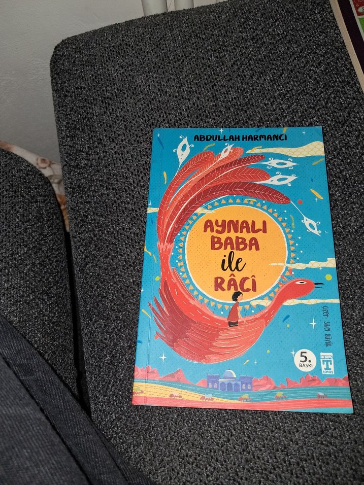 Abdullah Harmancı'nın yazdığı 'Aynalı Baba ile Râci' adlı roman, renkli kapak ve büyük kırmızı kuş çizimiyle. 5. baskı.