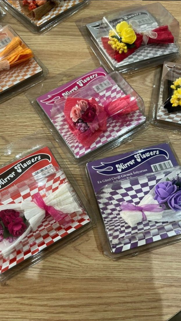 Çeşitli canlı renklere sahip, hediye veya dekorasyon için uygun renkli dekoratif çiçek setleri.