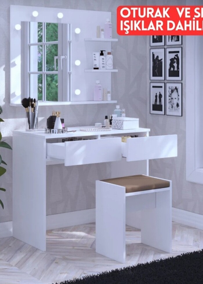 Spot ışıklar dahildir 2 çekmeceli sandalyeli makyaj masası dolabı