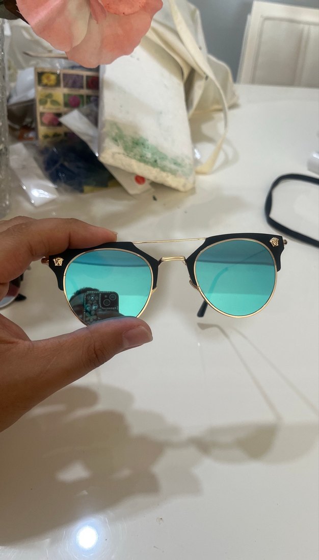 Klasik sokak tarzına uygun, parlak turkuaz yuvarlak kadın güneş gözlüğü. Parlak camlar rock punk havası katıyor. Mağaza teşhir ürünü
