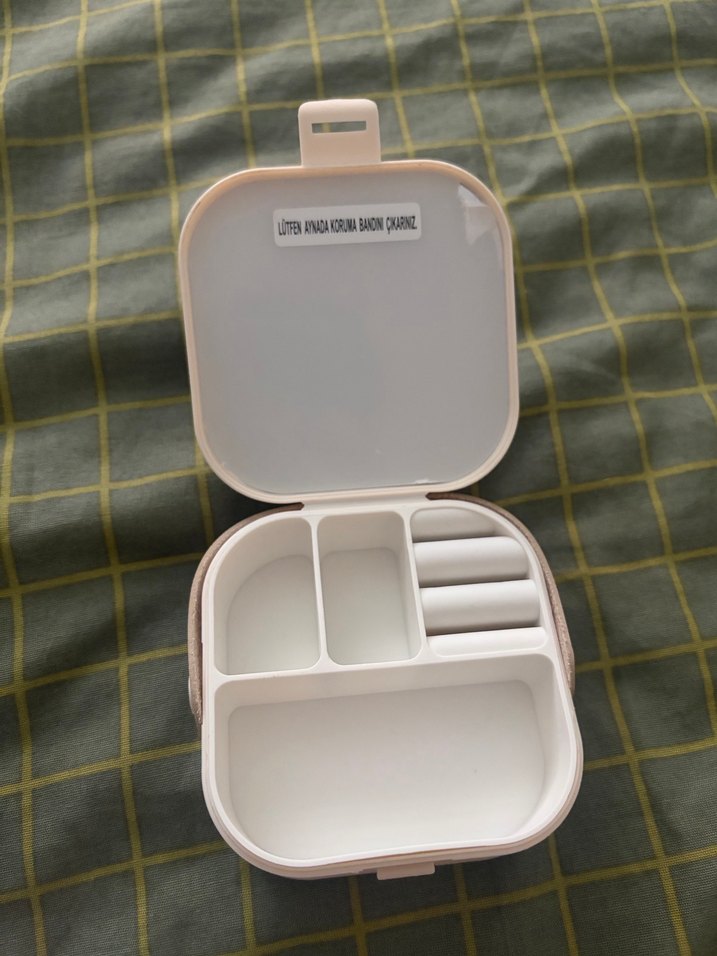 Bej renginde, çeşitli bölmeleriyle makyaj malzemelerini düzenlemeye uygun kompakt takı kutusu.