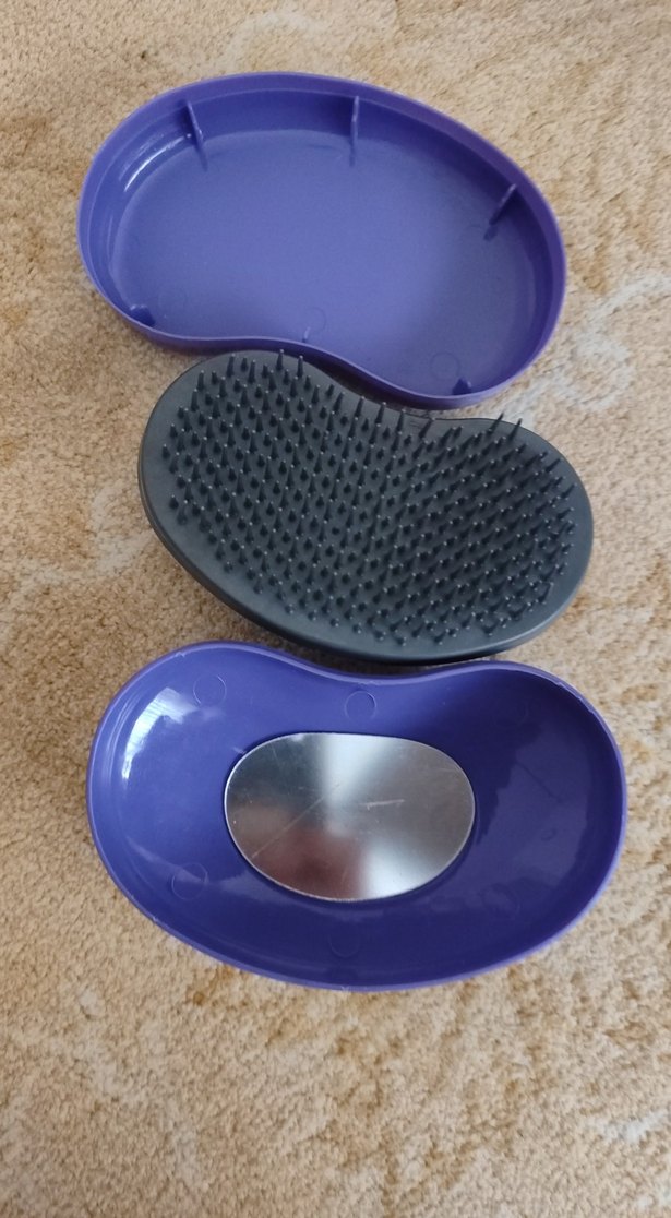 Esnek kıllı ve içinde ayna bulunan, taşınabilir mor kutuda kompakt saç fırçası. Hareket halindeyken bakım için uygundur.