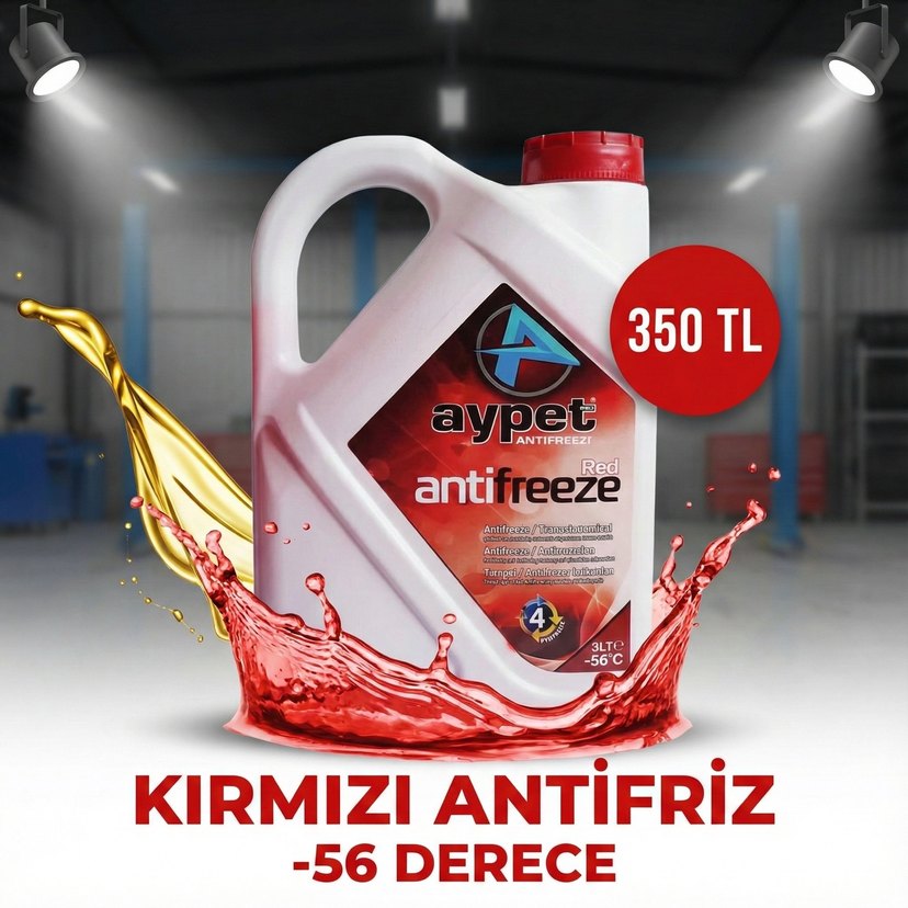Aypet kırmızı antifriz -56 dereceye kadar koruma sağlar. 3 litrelik ambalajda, fiyatı 350 TL'dir. Soğuk havalarda motor koruması için uygundur. ❄️