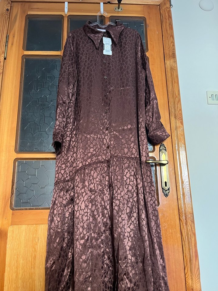 Düğmeli, uzun kollu, bol kesim kahverengi elbise. İpeksi kumaştan, yaka detaylı ve batik desenlidir. Mütevazı bohem tarzını yansıtır.