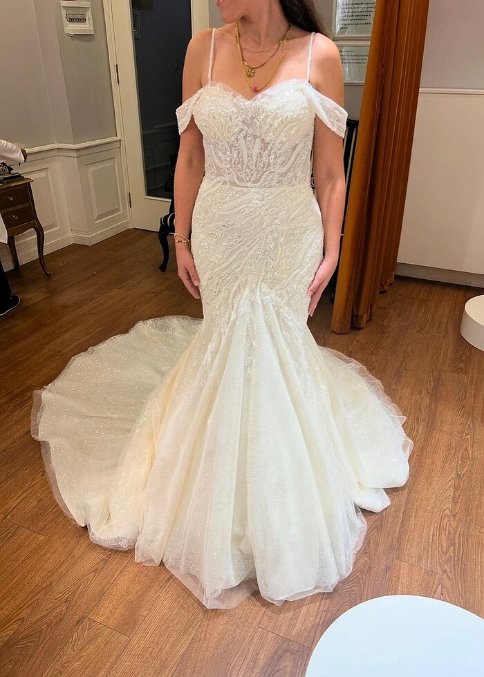 Aysira mağazasından almış olduğum gelinliğimi satıyorum. Düğün yapmadım yalnızca nikahımda giyindim. Hiçbir sorunu yoktur. Tadilatı yoktur. Sadece ışıltılı omuz askıları ve göğüslerine glop takıldı, boyu bedeni zaten tam üstüme göre olduğu için tadilat yapılmadı. Benim alt bedenim 38-40 üst bedenim 36-38. Düz duvak ile birlikte gönderilecektir. Hediye olarak da son görseldeki firketeli tokaları göndereceğim ☺️