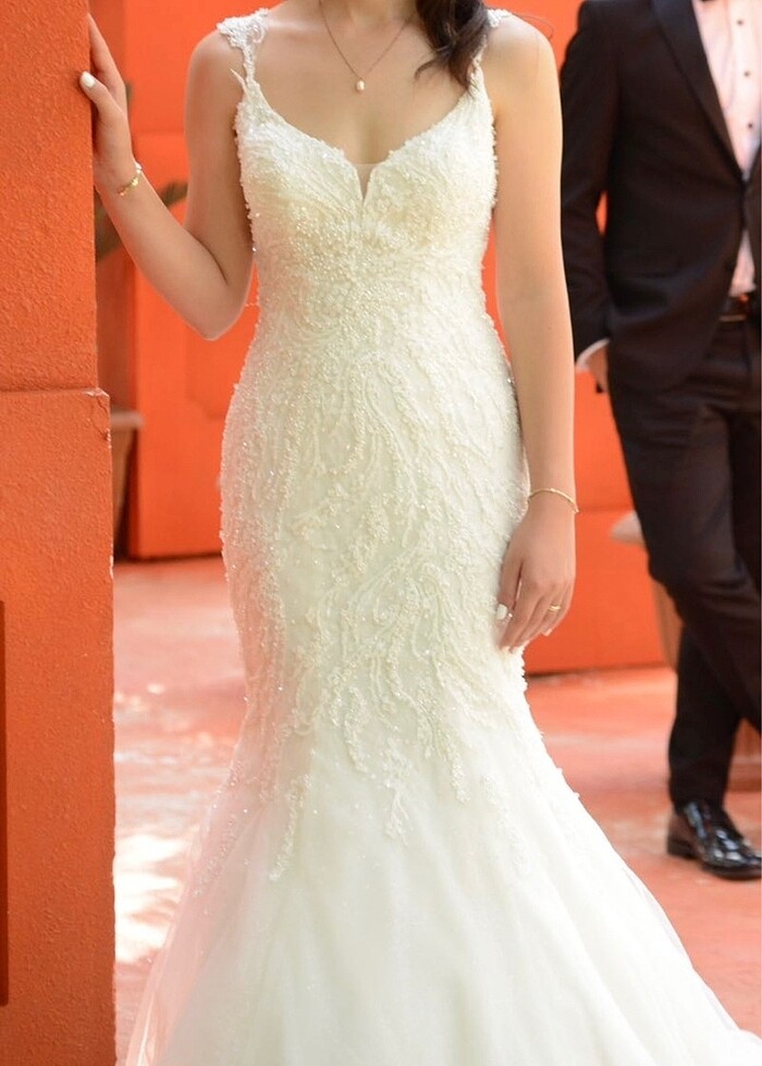 Ürünü geçen sene ağustos ayında aldım. Bir kere kullanıldıği için tertemiz. İşlemeli taşları ile çok şık bir model. Aysiranın en tutulan ve beğenilen gelinliklerinden. Balık model. Şu an sitesinde fiyatı 54 bin TL. Tarlatanı ve duvağı ile birlikte gönderilecektir. İsteyene detaylı fotoğraf atabilirim. 165 boyum 8 cm topuklu ile kullandım. Kilom 52.