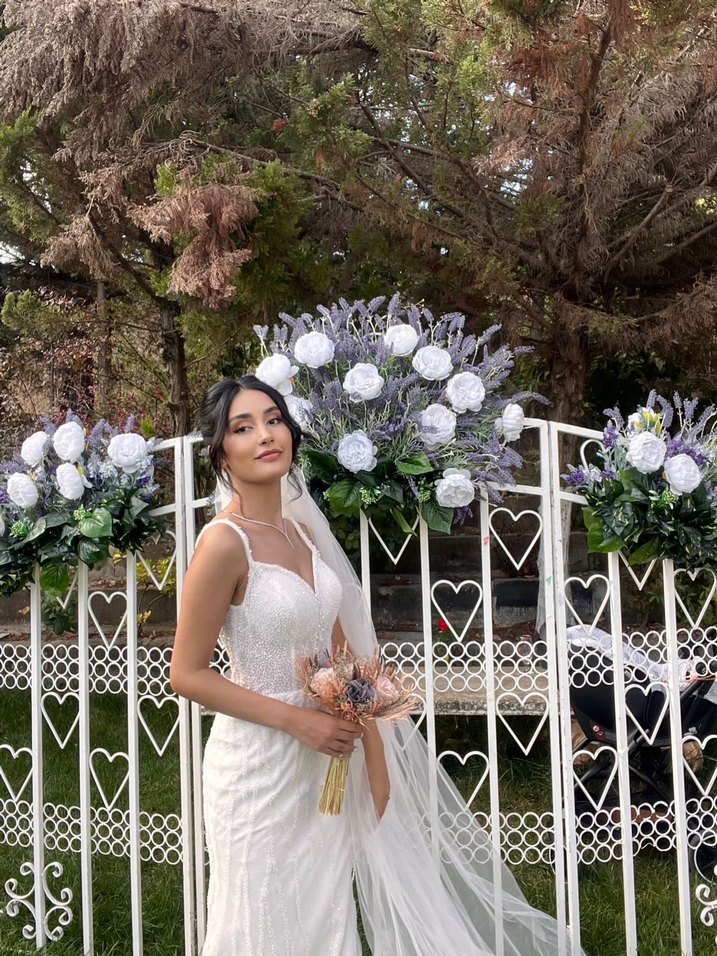 Yeni Sezon Beyaz renkte, klasik zarafet sunan uzun boy balık kesim bohem gelinlik duvağıyla birlikte verilir. Herhangi bir sorunu deformesi yoktur.
