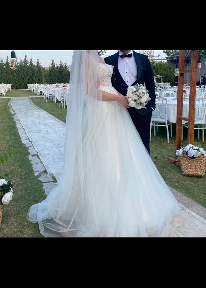 Gelinliğimi 2023 yılında aldım. Ürün kodu: 10GLST009161V01. Gelinliğin yaka kısmı pot duruyordu bunun için önden daraltıldı. Boyum 175 ve 4 cm topuklu ile giydim. Gelinlik 36 beden ama 34 bedene de iyi gelebilir. Sadece 3 saat düğünümde kullandım. Etek uçlarında kirlenmeler var, isterseniz kuru temizleme yaptırabilirsiniz.