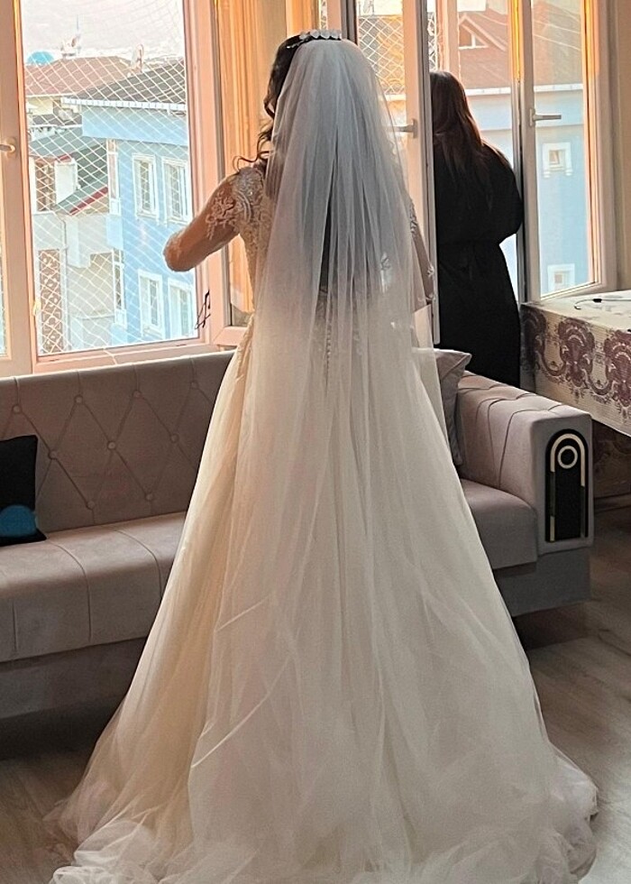 Aysira gelinlik. 36-38 beden uyumlu. Yanında duvağı ve tarlatanı verilecektir. İsteyene detaylı video çekebilirim. Durumu iyi sadece düğünümde giydim. Boyum 1.70 topuklu giydim. Arka kuyruğu uzun.