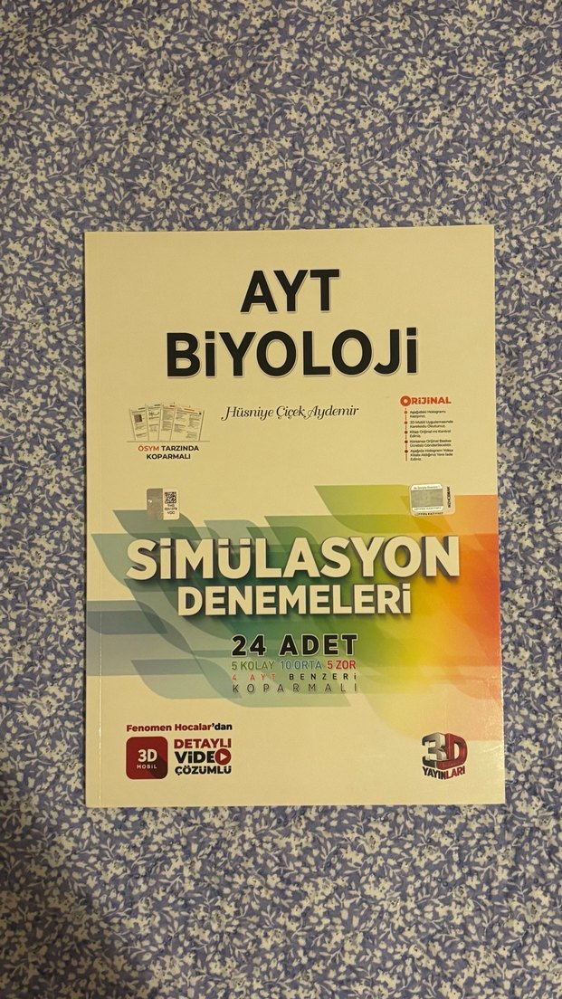 AYT Biyoloji için 24 adet simülasyon deneme kitabı. 5 kolay, 10 orta, 5 zor test ve detaylı video çözümleri içerir.Hiç kullanılmamıştır