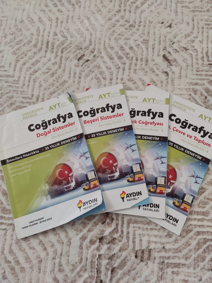 AYT Coğrafya sınavına yönelik Doğal Sistemler, Beşeri Sistemler ve Çevre & Toplum konularını içeren 4 kitaplık soru bankası seti.