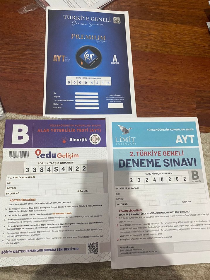 AYT üniversite hazırlık için Türkiye geneli deneme sınavları seti, Sinerjik ve Limit Yayınları tarafından alan yeterlilik testleri içerir.