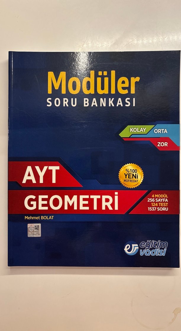 Mehmet Bolat imzalı AYT Geometri soru bankası, 256 sayfa, 1.537 soru ve 124 test içerir. Kolay, orta ve zor seviyeleri kapsar.