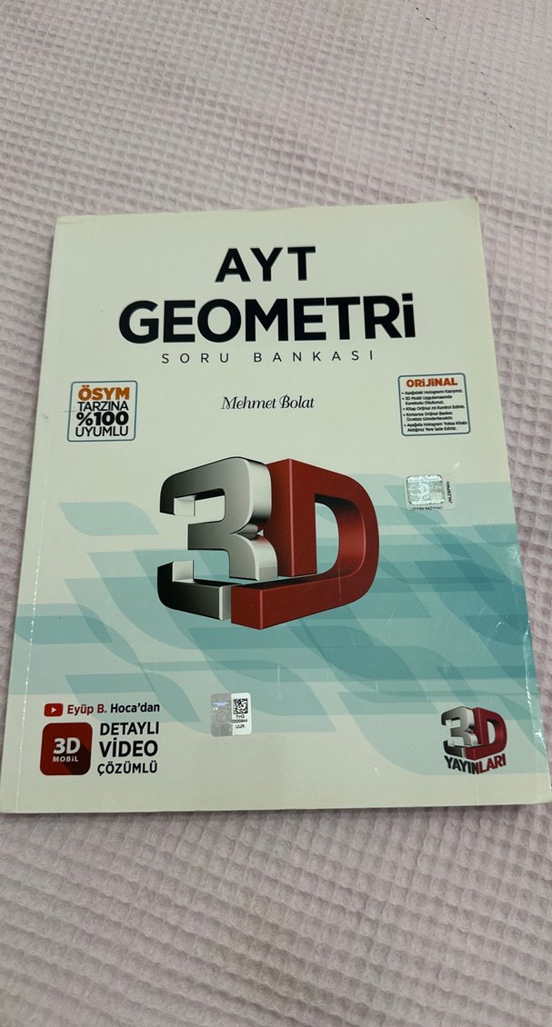 3D Yayınları tarafından hazırlanan AYT Geometri soru bankası, video çözümlerle desteklenmiştir. Sıfır kitap hiç kullanılmadı. Alındığı günden beridir raftadır.