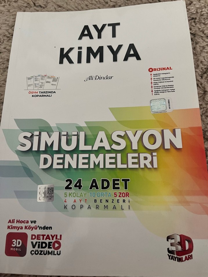 ÖSYM tarzında 24 adet koparılabilir AYT Kimya simülasyon denemesi içerir. Detaylı video çözümlü, 5 kolay, 10 orta, 5 zor test bulunur. 3D mobil desteklidir.