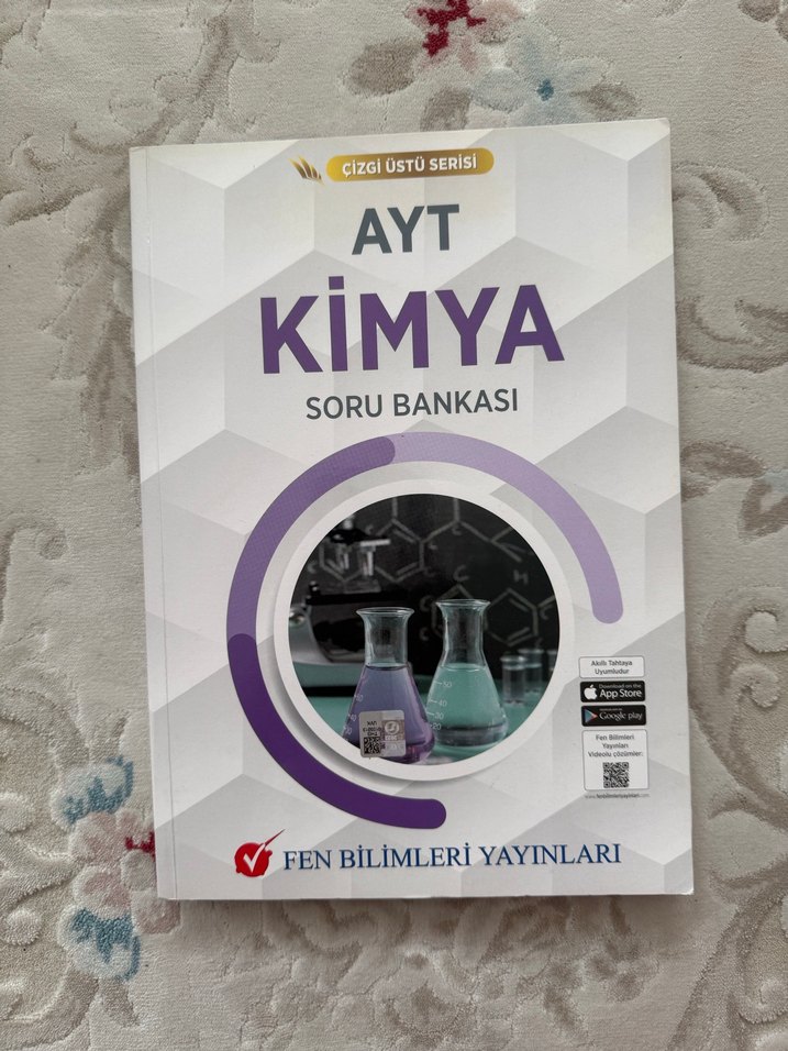 Fen Bilimleri Yayınları tarafından hazırlanan AYT Kimya Soru Bankası, Çizgi Üstü serisinden, sınav hazırlığı için. atom ve periyodik tablo konusunda ilk dört test çözülmüştür geri kalanı boştur