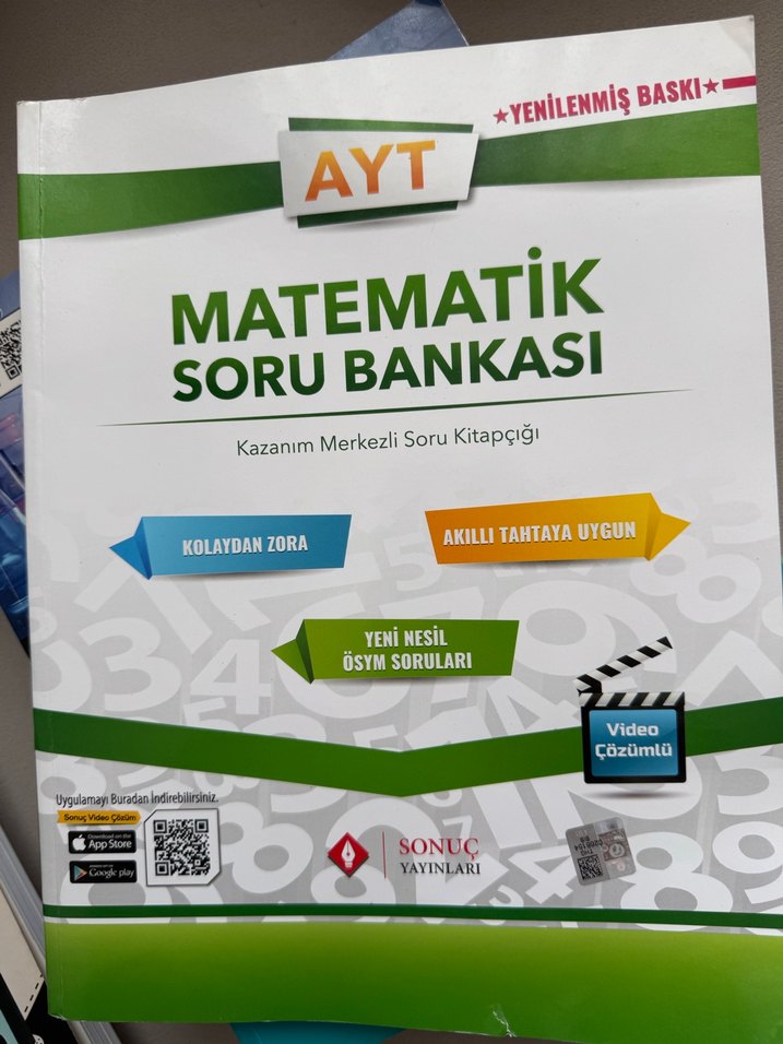 AYT Matematik Soru Bankası, kazanım merkezli sorular, yeni nesil ÖSYM soruları ve video çözümleri içerir. Akıllı tahtaya uygun, kolaydan zora sıralanmıştır.