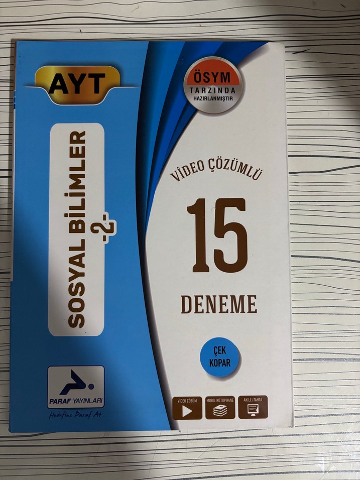 ÖSYM tarzında hazırlanmış, video çözümlü 15 adet koparılabilir deneme içeren AYT Sosyal Bilimler-2 kitabı.