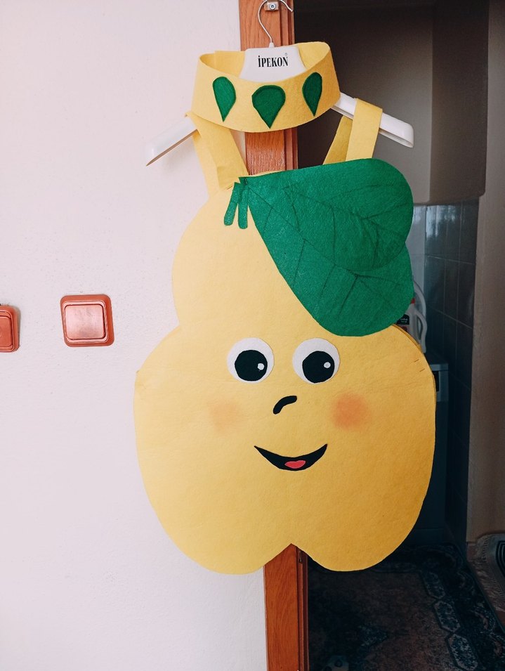 Sarı renkli, renkli baskılı, gülümseyen yüz ve yeşil yaprak detayı olan ayva önlüğü ve taçı IPEKON markalı. keçeden yapılmış