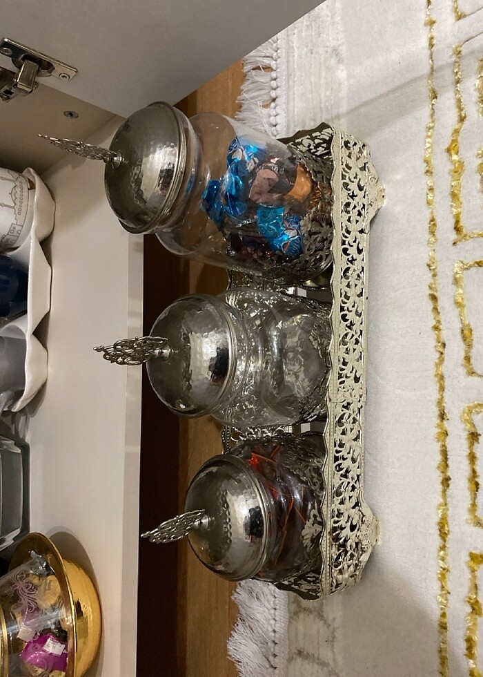 3 lü cam gümüş rengı kapaklar tepsısıyle verilecek küçükte alt kısmı bura pas gıbı olmuş alta görünmüyor