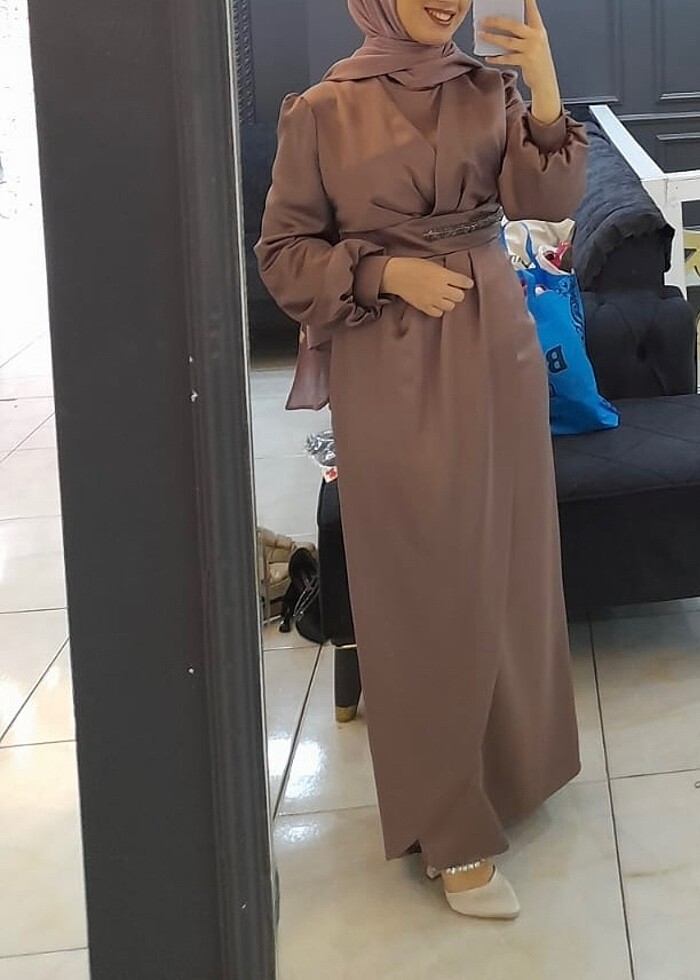 Saten elbise çok şık şal dahildir 42 beden uyumludur Gül kurusu rengi